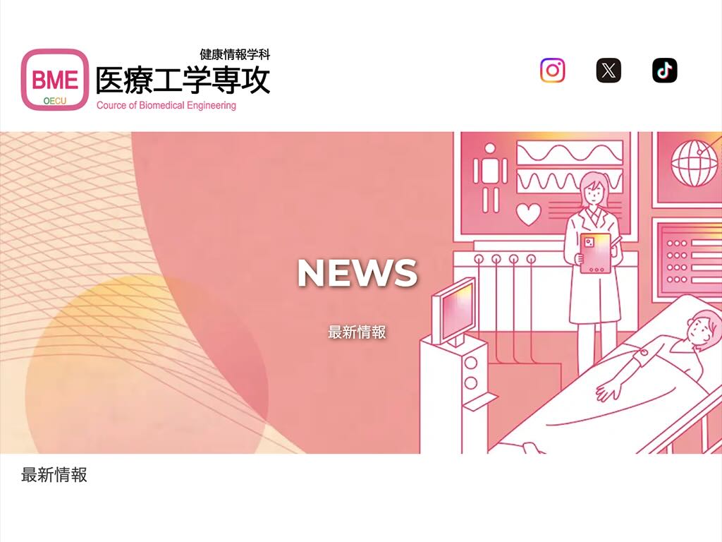 2025年4月より健康情報学部 健康情報学科 医療工学専攻として,新たにスタートしました。医療工学専攻独自の新しいホームページは以下のURLから閲覧できます。医療工学専攻の様々な情報を提供していきますので,引き続き,よろしくお願いいたします。