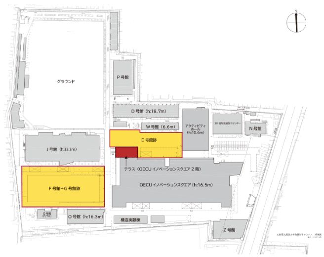 場所 大阪電気通信大学 寝屋川キャンパス E号館・F号館・G号館跡地 面積 E号館跡 約1200㎡