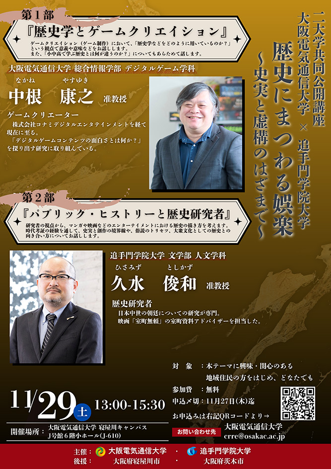 11月29日(土)、大阪電気通信大学 寝屋川キャンパスで開催される、追手門学院大学との二大学共同講座「歴史にまつわる娯楽 ~史実と虚構のはざまで~」に総合情報学部デジタルゲーム学科 中根康之准教授が登壇します。