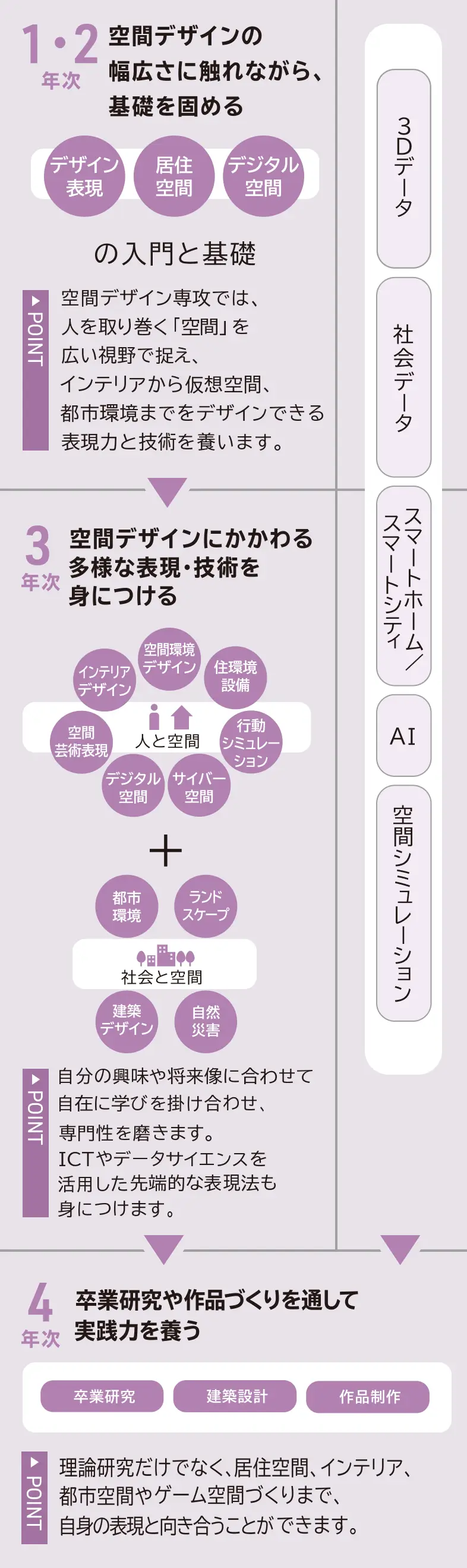 都市や建築、インテリアまで、人間を取り巻くあらゆる空間が対象です。建築技術とともにVRやARなどの情報技術に関する知識・技術を修得。新しい技術を用いた表現方法で、データなどの情報空間やメタバースなどの仮想空間までデザインできるカリキュラムを展開します。