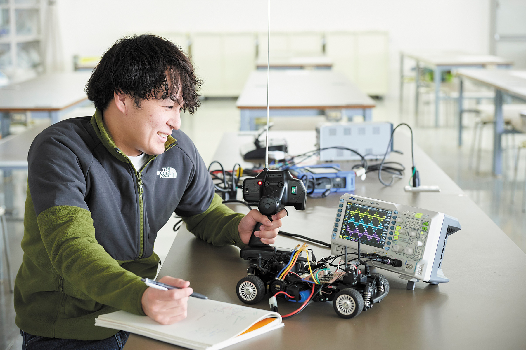 高校で電気工事士を取得した私は、電子部品や半導体の知識を身につけたくてこの学科へ。学内プロジェクトの自由工房に参加し基板から自作したロボットで大会に出場するなど、専門知識を深めながらモノづくりを楽しみました。卒業後は大学で取得した資格や知識を活かして、鉄道の安全を技術面で支える仕事に励みながら、ロボット大会にも出場し続けて上位入賞をめざします!