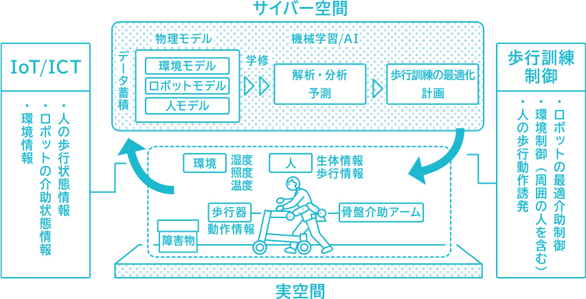 通信技術やセンサ、データ処理の進化によって飛躍的な発展を遂げているロボットは、いまや私たちの喜らしを支える重要な存在です。小川研究室と鄭研究室では、実世界とサイバー空間が連携するサイバーフィジカルシステム(CPS) を活用した歩行訓練環境をつくろうとしています。歩行訓練器に実装したセンサで歩行パラメータを計測し、クラウドサーバーでデータベース化、処理したデータをもとにロボットアームを制御してその人に最適な訓練補助を実施します。こうした研究開発は安全で効率の良いリハビリテーションの実現と現場の人材不足を解決する可能性を秘めています。