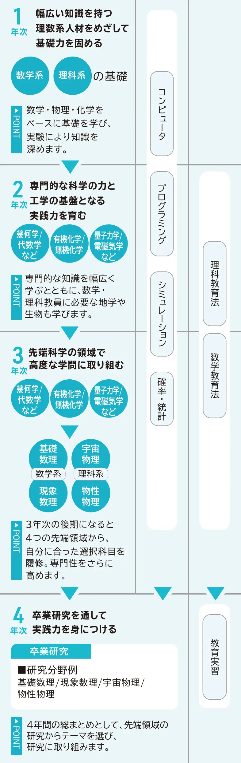 工学の基盤となる科学(数学・物理・化学)の専門知識を獲得すると同時に、それらを活かす理論や技法を修得。物事を「根っこ」から追究・分析する基礎力と真の応用力を持ち、先端科学技術から教育まで、幅広い舞台で活躍できる理数系ジェネラリストを育成します。