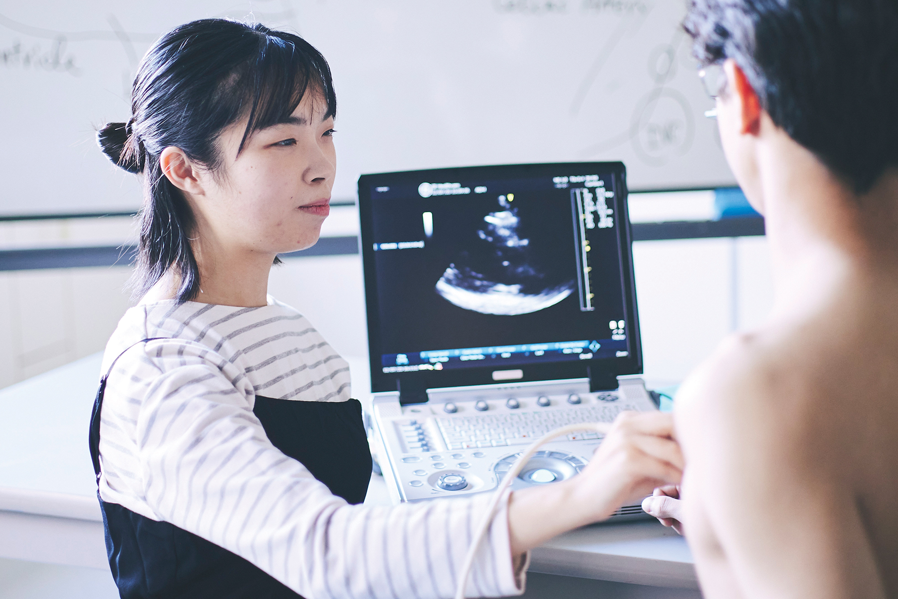 超音波断層装置(エコー)や心電計・血圧計を実際に操作し、身体を観察・計測します。得られた画像やグラフから体内の状態を推察し、機器の操作だけでなくデータを分析する力をそなえた技士をめざします。