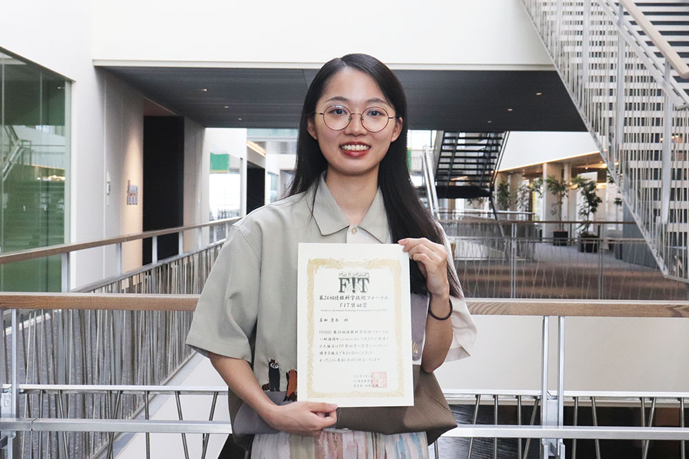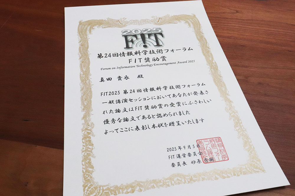 9月3日(水)から5日(金)まで、北海道科学大学(北海道札幌市)で開催された「第24回情報科学技術フォーラム(FIT2025)」で、真田貴衣さん(大学院工学研究科電子通信工学コース 佐藤研究室2年)がFIT奨励賞を受賞しました。