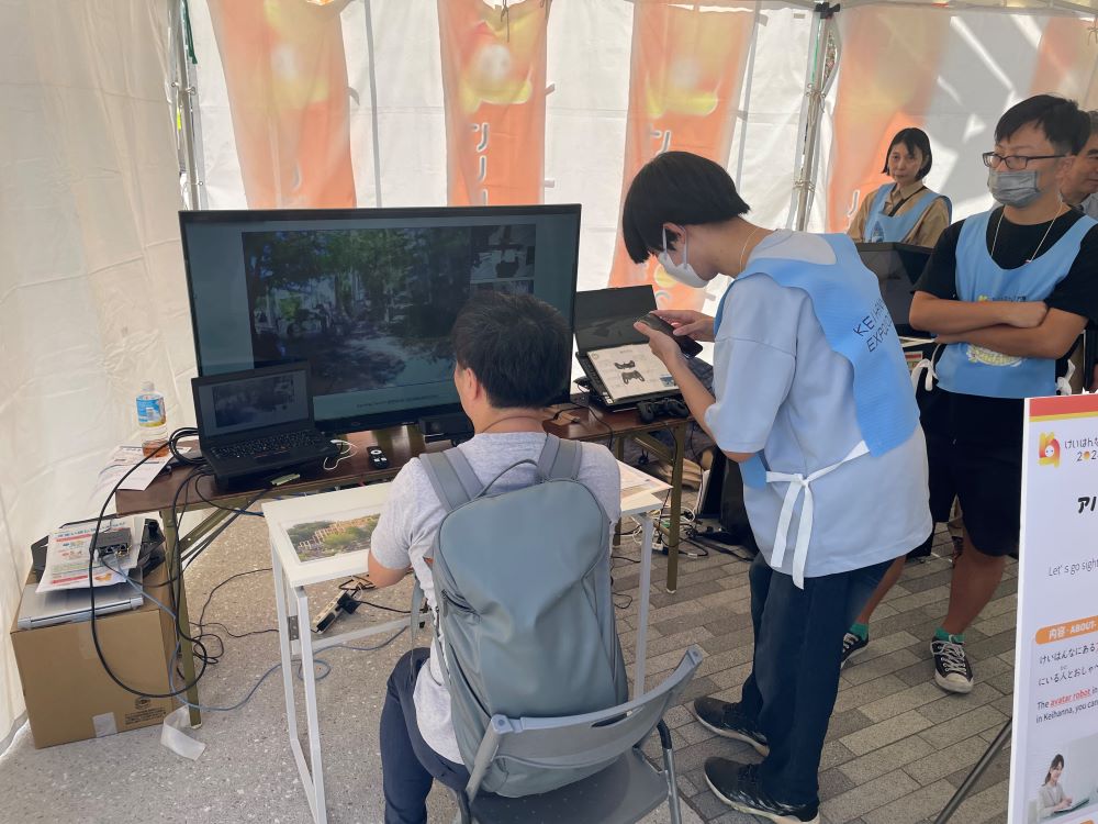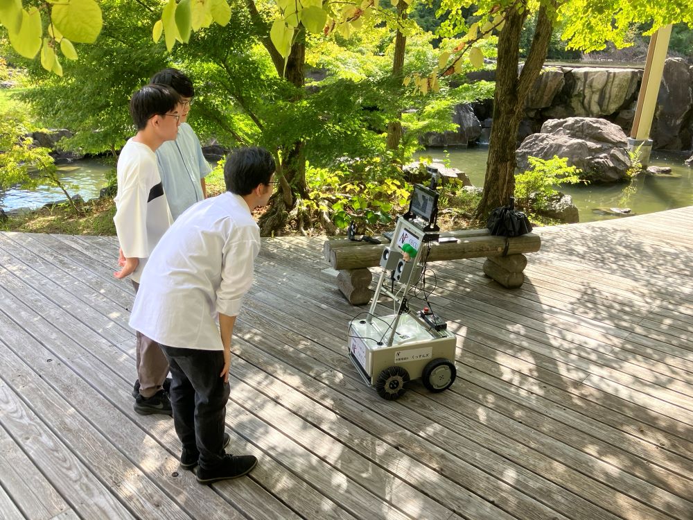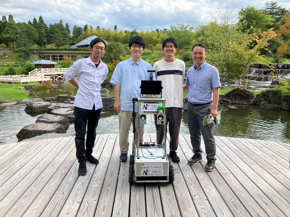 当日は、万博会場にアバターオペレータを担当する学生3人とアナウンス担当の学生2人、教員1人が参加し、水景園にはアバターロボットを操作する学生2人と教員2人が配置されました。ツアーは午前・午後の2回実施され、午前は通信環境も良好で円滑に進行。午後は来場者数の増加に伴い通信に遅延が生じたものの、約20人の参加者が遠隔で水景園の景観を楽しみました。