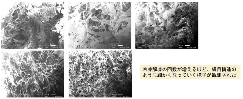 SEM(電子顕微鏡)観察により凍結乾燥後の試料で網目構造を観測。冷凍・解凍サイクル回数の増加に伴い、網目サイズが縮小し、ネットワーク密度の増加が明らかに。
