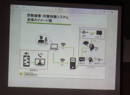 ■【学生の技術力】 情報工学科や情報学科の学生が、四條畷警察署提供のシナリオをもとに 、最新のAI技術を活用した特殊詐欺被害等防止システムを開発 。