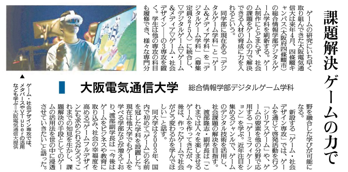10月11日(土)、読売新聞朝刊「進学特集」で2026年4月開設のデジタルゲーム学科が紹介されました。
