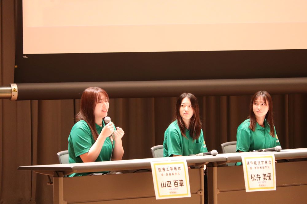 在学生トークLIVEでは、各学科専攻から学生が登壇し、本学を選んだ理由や大学生活、高校生へのアドバイスなどを話しました。「就職に強い」「臨床工学技士になりたい」など、将来を見据えた進学理由や、高校生へのアドバイスとして「大学は自由だからこそ、自分のやりたいことを見つけることが大切」といった言葉が印象的でした。