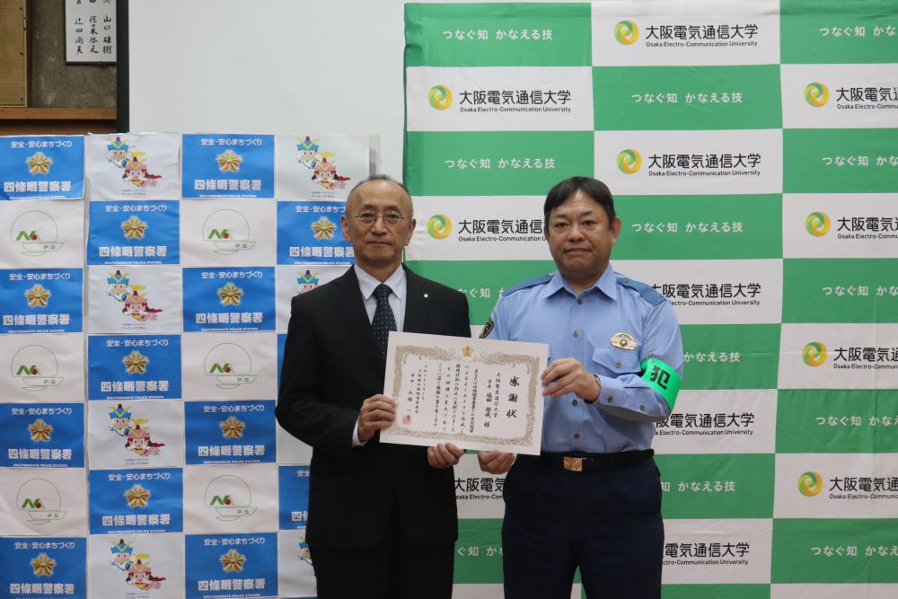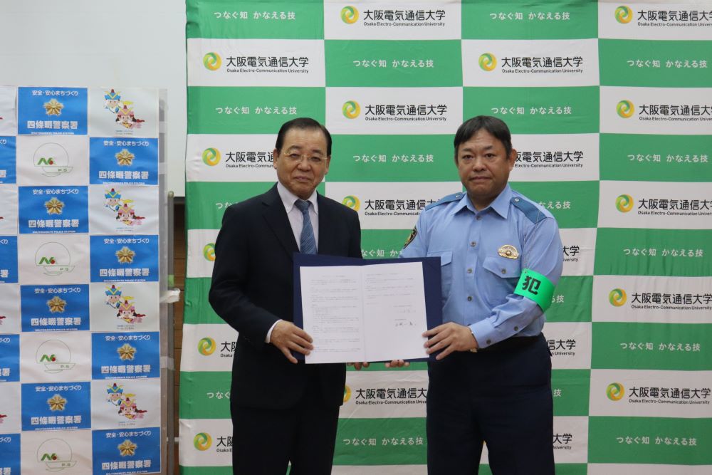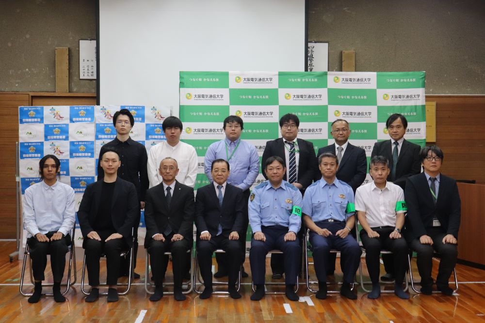 10月10日(金)、四條畷警察署(大阪府大東市)にて「安心・安全なまちづくりに関する連携協定」を締結しました。締結式には四條畷警察署から山岡一馬署長、副署長、生活安全課長が出席し、本学からは大石利光理事長、塩田邦成学長、開発に携わった教員・学生が出席しました。