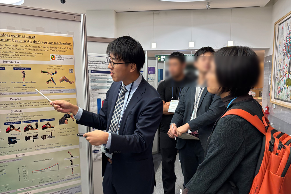 受賞にあたり稲田さんは、「先生方のご指導のおかげで若手研究奨励賞をいただくことができました。ご指導いただいた先生方、研究室の仲間、そして装具制作にご協力いただいた3D造形先端加工センターの方々に感謝申し上げます。初めての国際会議で、英語での質疑応答に課題が残る中、受賞できたことに驚きました。発表を振り返ると、新たに開発した『PCL装具』の提案やポスターの見やすさが評価につながったのではないかと思います。装具を開発する中で、新しいものを形にすることの難しさや、工学的なメカニズムの理解に苦労しましたが、今後はPCL損傷に悩む方々にとって実際に有用な装具となるよう検証を進め、医学・理学療法分野の発展に貢献したいです」と語りました。