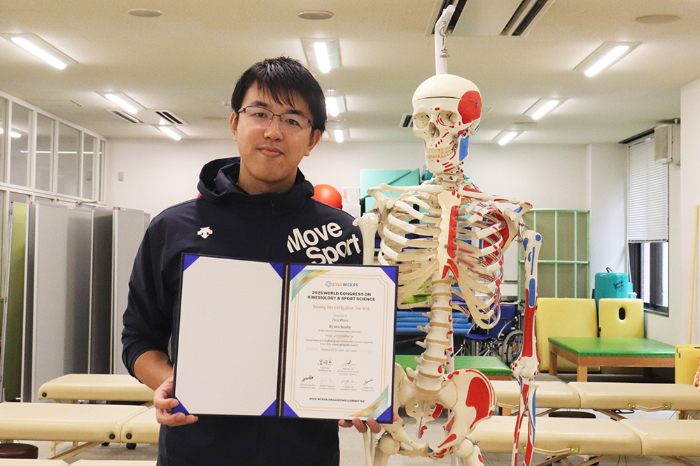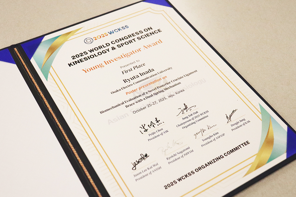 10月25日(土)から27日(月)の3日間、韓国・済州島で開催された「2025全世界運動学・スポーツ科学連合学術大会(World Congress of Kinesiology and Sport Science,WCKSS)」で、稲田竜太さん(大学院 医療福祉工学研究科医療福祉工学専攻博士後期 1年 小柳研究室)が、若手研究奨励賞(Young Investigators Award,YIA)を受賞しました。