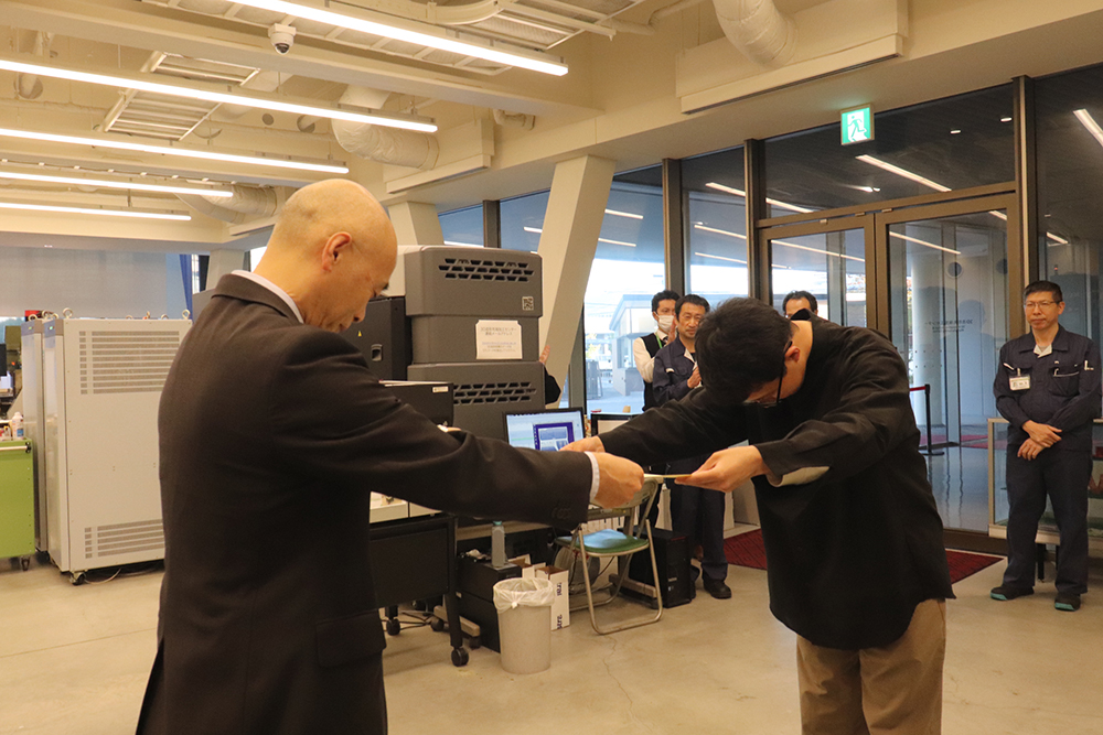 授与式には、センター長 田代徹也教授、実験サポート課職員、受験者4人が参加。今回は受験者全員が合格し、田代センター長から合格証書とバッジ、3D造形先端加工センターの機械を使って作られたプレートが授与されました。