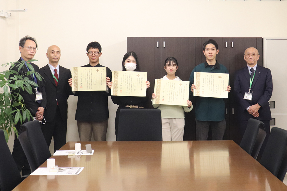 授与式後、田代センター長と学生らは塩田邦成学長へ合格の報告を行いました。塩田学長は賞状とバッジを手に取りながら、努力を労いました。