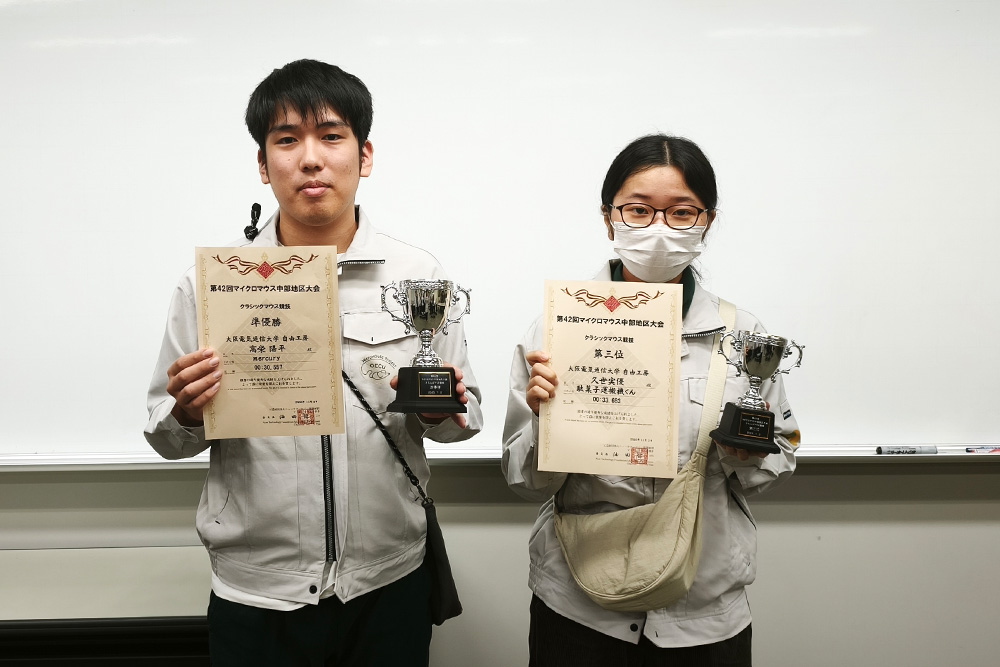 クラシックマウス競技では、高榮陽平さん(工学部電子機械工学科 2年)が準優勝、久世実優さん(同学部電気電子工学科 3年)が第3位を受賞。また、マイクロマウス競技では、坂上公哉さん(同学部電子機械工学科 3年)が特別賞を受賞しました。