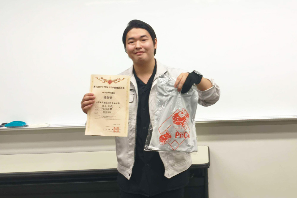 高榮さん「1年生の頃から出場しており、今回初めて受賞できて嬉しいです。迷路が想像以上に難しく完走できるか不安でしたが、安定走行を重視したことが結果につながりました。今後は、軽量化と速さ、安定走行のバランスを高め、自己ベスト更新を目指します」