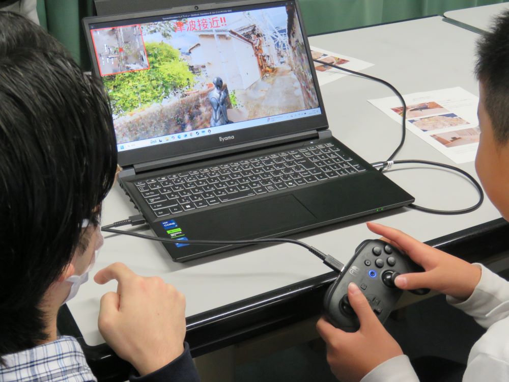 「VR脱出ゲーム」では、徳島県の実在する町を3Dで再現した空間で、津波から高台へ避難するシミュレーションに挑戦。地震により塀が崩れたり車で道が塞がれたりする状況を体験することで、複数の避難経路を想定しておく重要性を学びました。