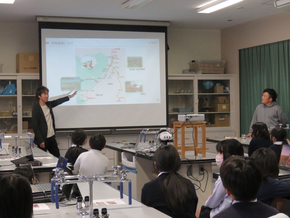 前半は南海電気鉄道株式会社より、地震発生時の鉄道システムの動作や社員の防災訓練、駅に備蓄されている非常食の状況など、鉄道会社が行う防災の取り組みについて説明がありました。児童は、災害時に駅員の指示に従う大切さについて理解を深めていました。