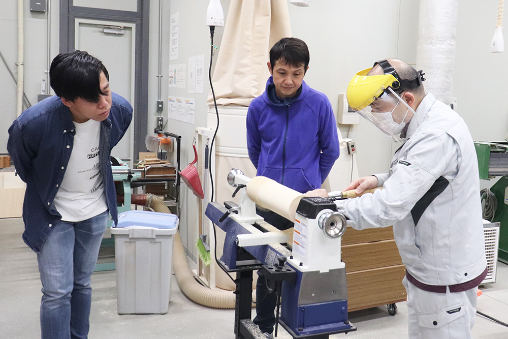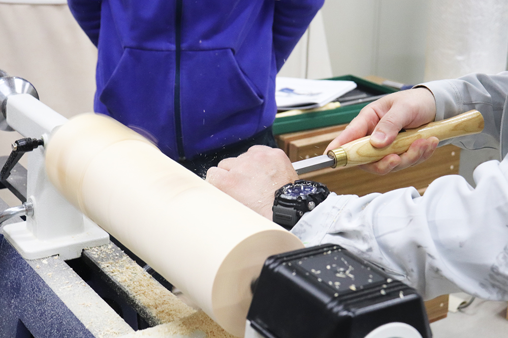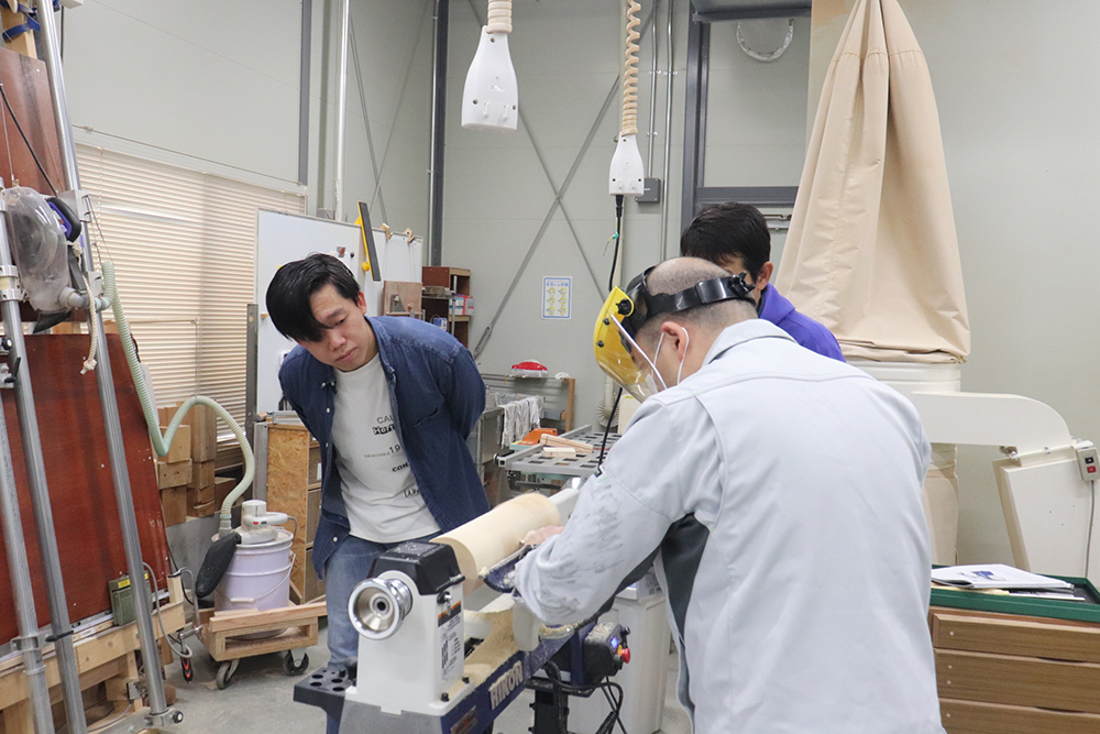 本学では、本支援制度を活用し、木工室に新たに導入された加工機の木工旋盤に特化した講習を実施。学内指導員の養成と、学生の家具製作における技能向上を目的とし、マイスターの指導のもと学生と学内指導員が実習に取り組みました。