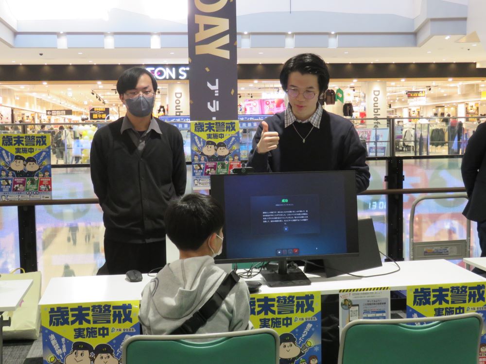 本学は、知見と技術を活用し、特殊詐欺を疑似体験することで防犯意識を高めることを目的としたシステムを提供しました 。特に今回のシステムは、前回からの警察官を装った詐欺に加え、新たにロマンス詐欺、投資詐欺、子どもの連れ去りを追加した合計4種類のシナリオを作成 。来場者は、四條畷警察署から提供されたシナリオをもとに、AIによって作成されたリアルな特殊詐欺等の犯人とのやり取りを体験しました 。