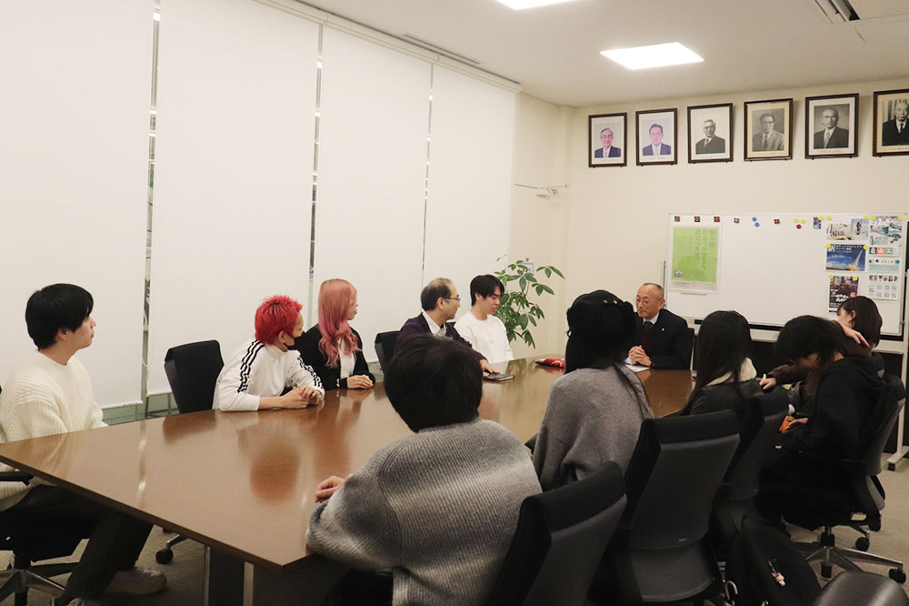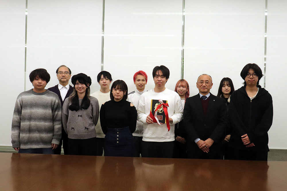 また、今回の受賞を受け、12月2日(火)受賞学生たちは森田教授とともに塩田邦成学長へ受賞の報告を行いました。テーマを考案した満山陽大さん(基礎理工学科数理科学専攻1年)は「奨励賞受賞という評価をいただけたことは光栄に感じますが、まだ十分に満足できていない部分もあります。来年は今回以上に時間と労力をかけて向き合い、より完成度の高い成果を目指して取り組んでいきたいと考えています」と話し、森田教授は「学生たちは限られた時間の中、普段の授業と並行しながら本当によく頑張ってくれていました。まだブラッシュアップできる部分や、取り組めることは多く残っているので、来年も一緒に挑戦していきます」と報告しました。
