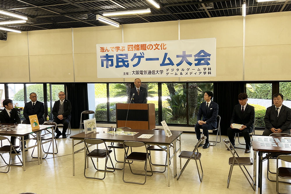 当日は、来賓として四條畷市の銭谷翔市長、木村実教育長、西尾佳岐社会教育部長が出席され、本学からは塩田邦成学長、渡部隆志副学長、大西克彦総合情報学部長が出席しました。はじめに、本学から教育委員会へゲームの贈呈を行い、塩田学長が主催者挨拶を行いました。続いて、銭谷市長よりお礼の言葉をいただき、ゲームの試遊が始まりました。