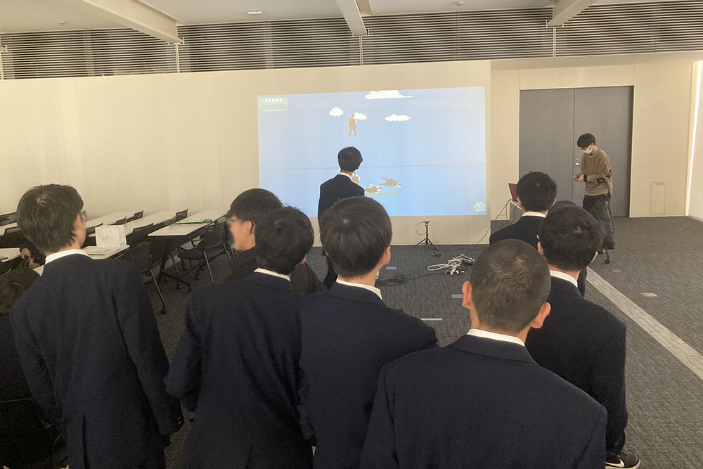 体験授業では、情報通信工学部情報工学科 間下以大教授が『ITエンジニアになろう-人工知能からIoTまで-』をテーマに授業を行いました。授業では、情報工学の技術や技術の発展による社会の変化、大学入学から卒業までの過程について説明しました。後半では、間下研究室の学生がゼミ活動の一環として制作したゲームを体験してもらい、楽しく情報技術に触れていただきました。