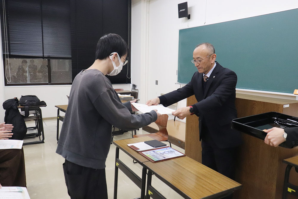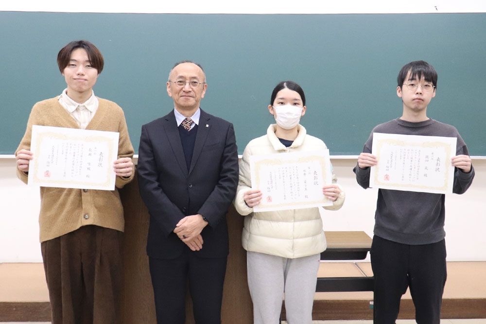 表彰にあたり、塩田邦成学長は、「皆さん一人ひとりの取り組みが、今回このように形となって表れた結果であると思います。日経キャリアマガジンにおいて本学が企業から非常に高い評価を得ていることも、日頃からの積み重ねの成果です。皆さんがしっかりと準備をして就職活動に臨めば、それは必ず企業からの評価につながります。就職後に、企業の方々から『本学の学生を採用してよかった』と思っていただけるよう、これからも就職活動に向けた準備に真摯に取り組んでください」と、今後の健闘を期待する言葉を贈られました。
