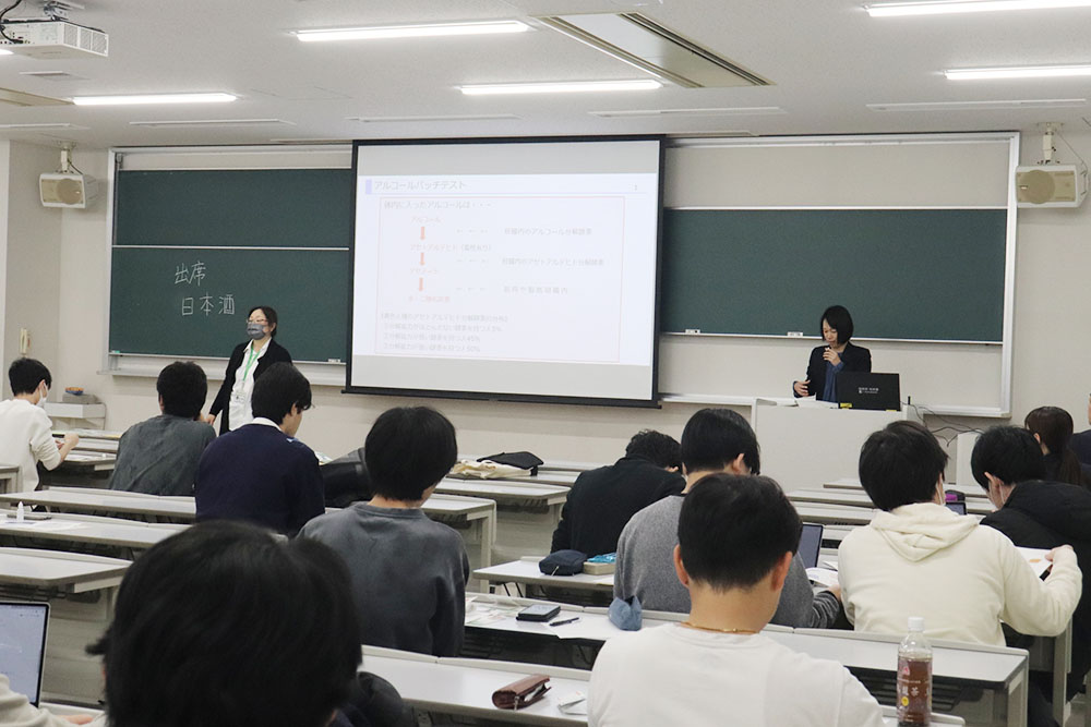 講義を受けた学生は「お酒について知らないことが多かったので、今日の講義を通して酒全般に興味を持つきっかけになりました。日本酒だけでも特定名称が8種類に分類されていることを知り、初めて受けたアルコールパッチテストも今後の参考になりました」と話しました。