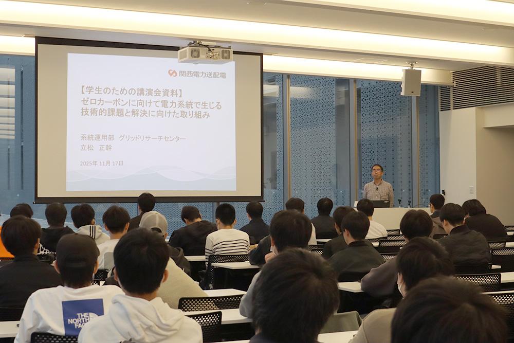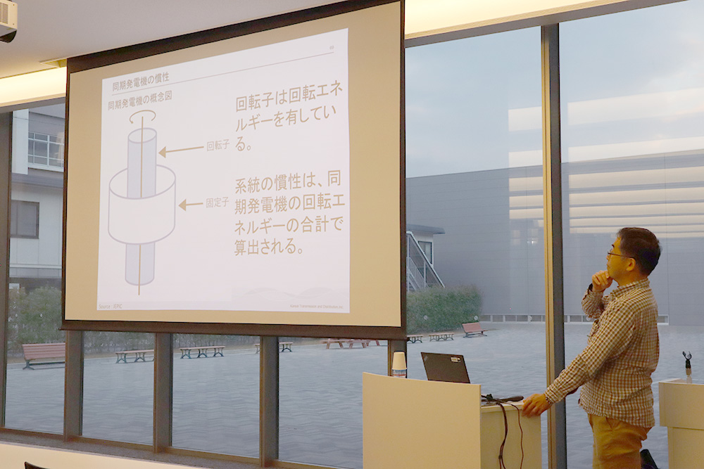 質疑応答では、「慣性が小さいと周波数が変動しやすくなるのか」「同期フェーザ計測装置(PMU)について詳しく聞きたい」「今までのゼロカーボンに対する取り組みでの効果はどれぐらいあったか」など、多くの質問が学生から寄せられました。