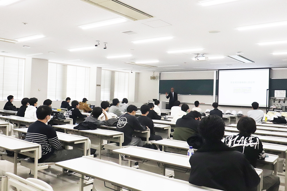 電気電子工学科では、株式会社きんでんの協力のもと、企業連携講座「送配電工学」を開講しています。本講座では、企業の第一線で活躍する専門家から、専門知識に加え実務での応用とつながりを学ぶことを目的としています。
