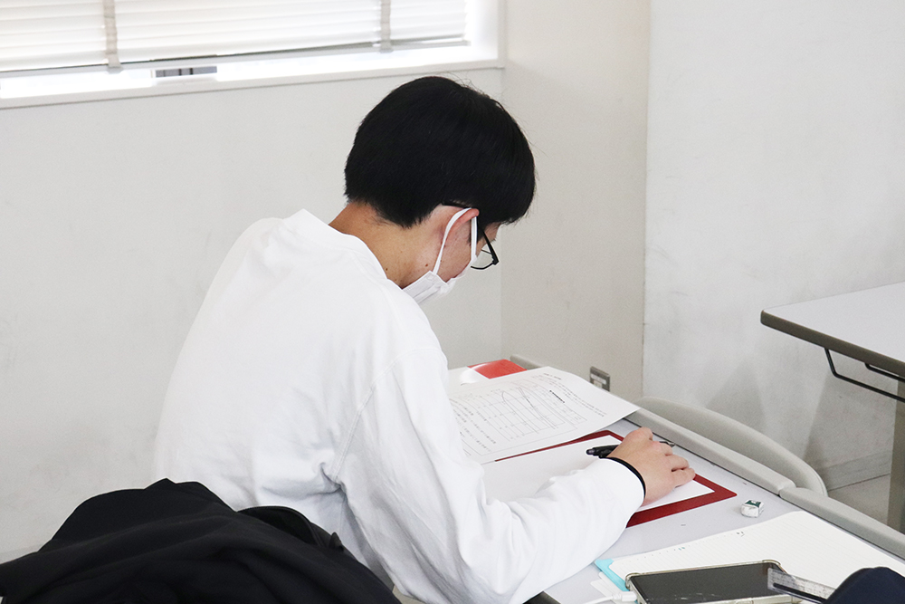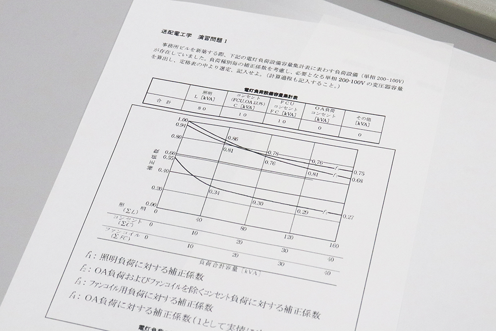 演習問題として“事務所ビルを新築する際の変圧器容量の算出”にも取り組み、これまでの学修内容をもとに考えながら、真剣に答えを導き出していました。