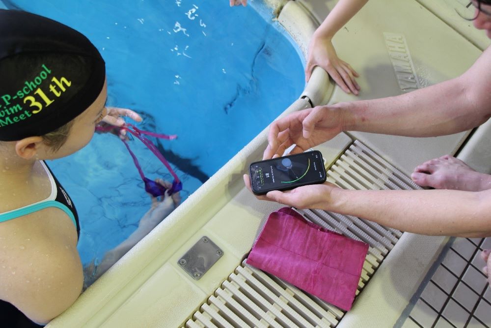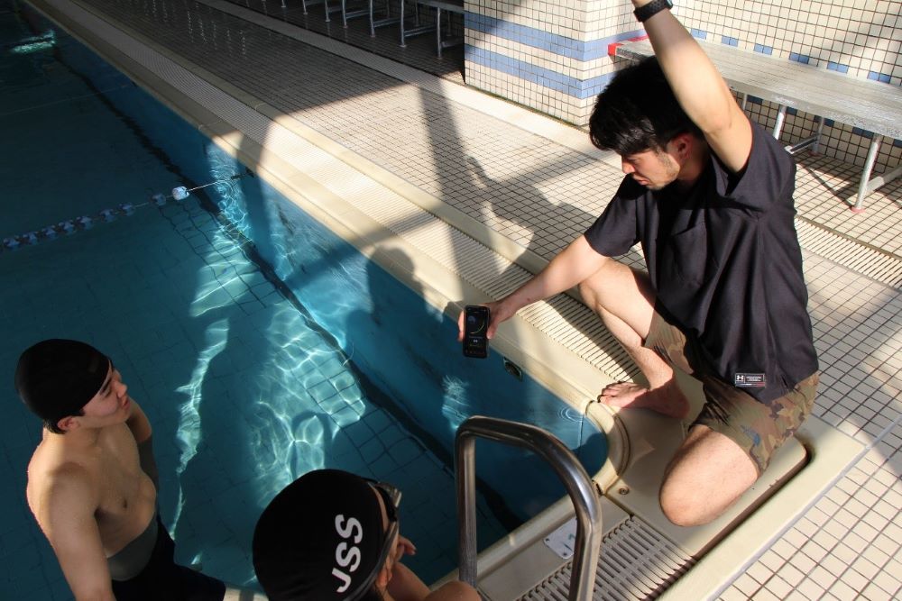 授業では、クロール泳中の頭の上下位置や息継ぎ時の頭の上げ角など、スマートフォンに表示された情報をもとに、スポーツ科学専攻の神野周太郎特任准教授が学生たちにパフォーマンス向上のための指導を行いました。