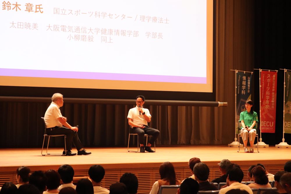 講演後は、健康情報学部部長 太田明美教授、同学部学科理学療法学専攻 小柳磨毅教授とのトークショーを行いました。両教授からICT機器やデータ分析の活用や大学での学びについて質問がありました。鈴木氏は「科学研究部門からのデータ分析と理学のデータなどさまざまなデータを活用する必要があるが、連携はまだ始まったばかり。競技団体との話し合いが必要で、データの活用はまだこれからになる。大学では日常生活やクラブでヒントになることがたくさんあるので、まずはやってみることから始めてほしい」と来場者にアドバイスをしました。
