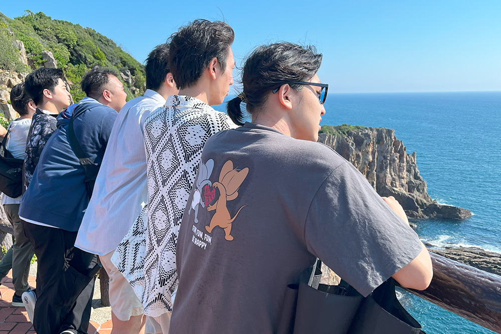 到着後は、ロッククライミングや絶景スポットで知られる「千畳敷」「三段壁」を観光。その後、宿舎に戻り、夕食後には懇親会が行われました。