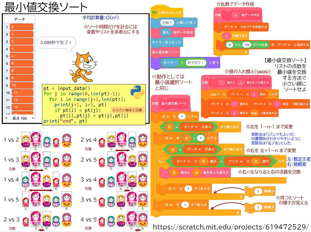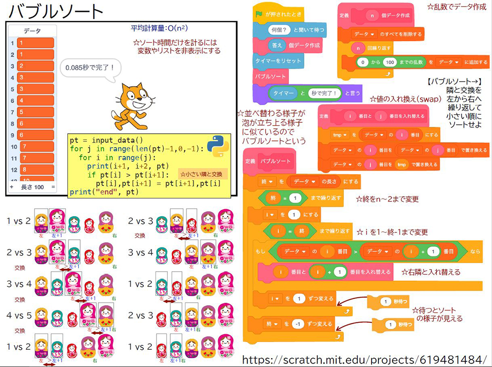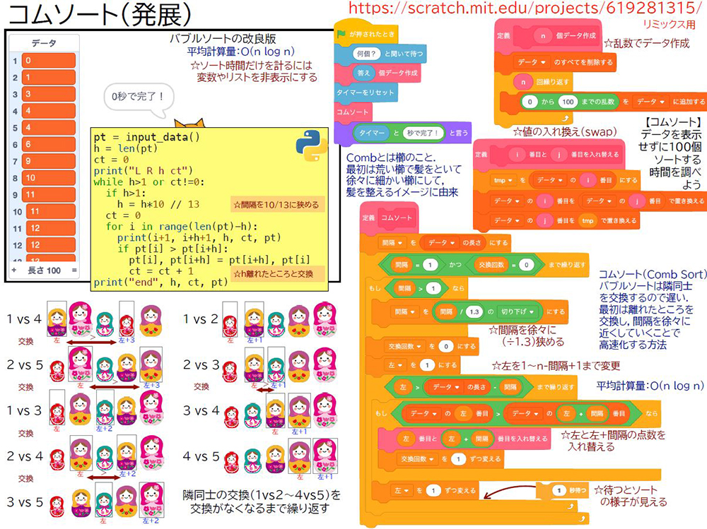 当日は、基本的なアルゴリズムである『選択ソート』『交換ソート』『バブルソート』に加え、実務でも広く使用されている『クイックソート』、そしてバブルソートを改良した『コムソート』の5種類を体験しました。